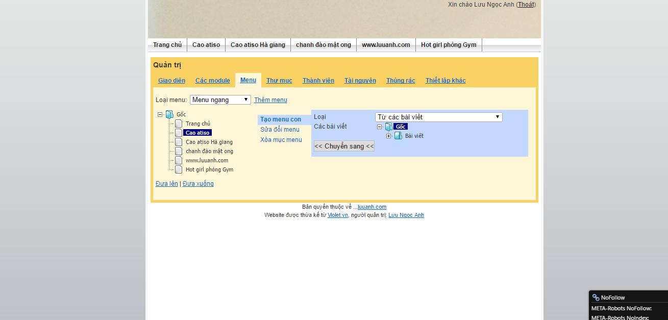 Bước 5: Để có thể chỉnh sửa được blog cá nhân theo ý muốn các bạn cần truy cập vào liên kết http://violet.vn/abcxyz/admin trong đó abcxyz là tên đăng nhập của các bạn. Để thêm backlink ở thanh menu, các bạn cần tạo menu mới bằng cách chọn Tạo menu con rồi nhìn ngay sang bên cạnh có mục Loại các bài viết, các bạn chọn tự nhập liên kết và thêm anchor text thôi.
