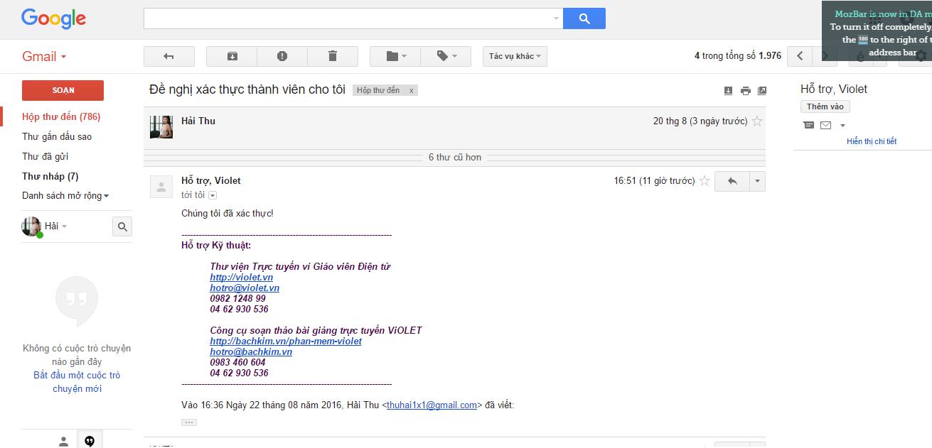Bước 2: Sau khi đăng ký là thành viên của thư viện điện tử Violet các bạn vẫn chưa thể thực hiện tạo Blog cá nhân trên website này được, các bạn cần xác thực danh tính để có thể tạo Blog và viết bài. Để xác thực tài khoản các bạn có thể nhờ người đã được xác thực cùng đon vị giúp đỡ tuy nhiên chúng ta là SEOer chứ không phải thầy cô giáo hay học sinh nên rất khó để quen ai đó có tài khoản được xác minh. Chúng ta đành dùng cách thứ 2 là gửi chứng minh thư gồm cả 2 mặt vào email sau đây cho ban quản trị để họ xác minh giúp các bạn: hotro@violet.vn . Các bạn chú ý để được xác thực các bạn cần để mọi thông tin y hệt như trên chứng minh thư, ví dụ tên không được viết tắt mà phải viết đầy đủ họ, tên đệm và tên.