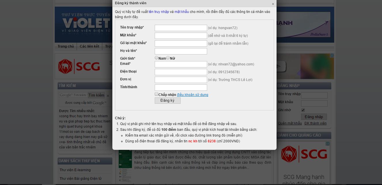 - Bước 1: Đăng ký làm thành viên của cộng đồng thư viện điện tử Violet, các bạn truy cập theo liên kết ở đây, điền đầy đủ thông tin vào và nhớ xác nhận email nhé.
